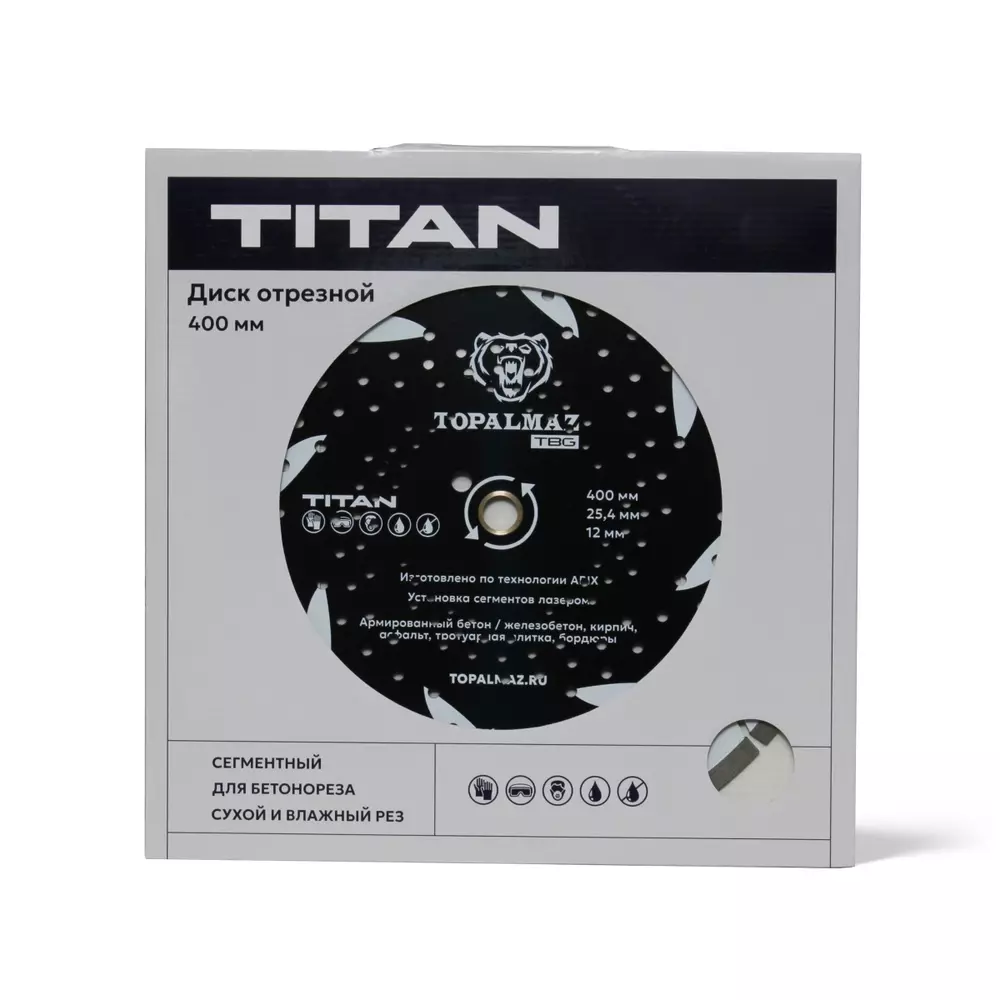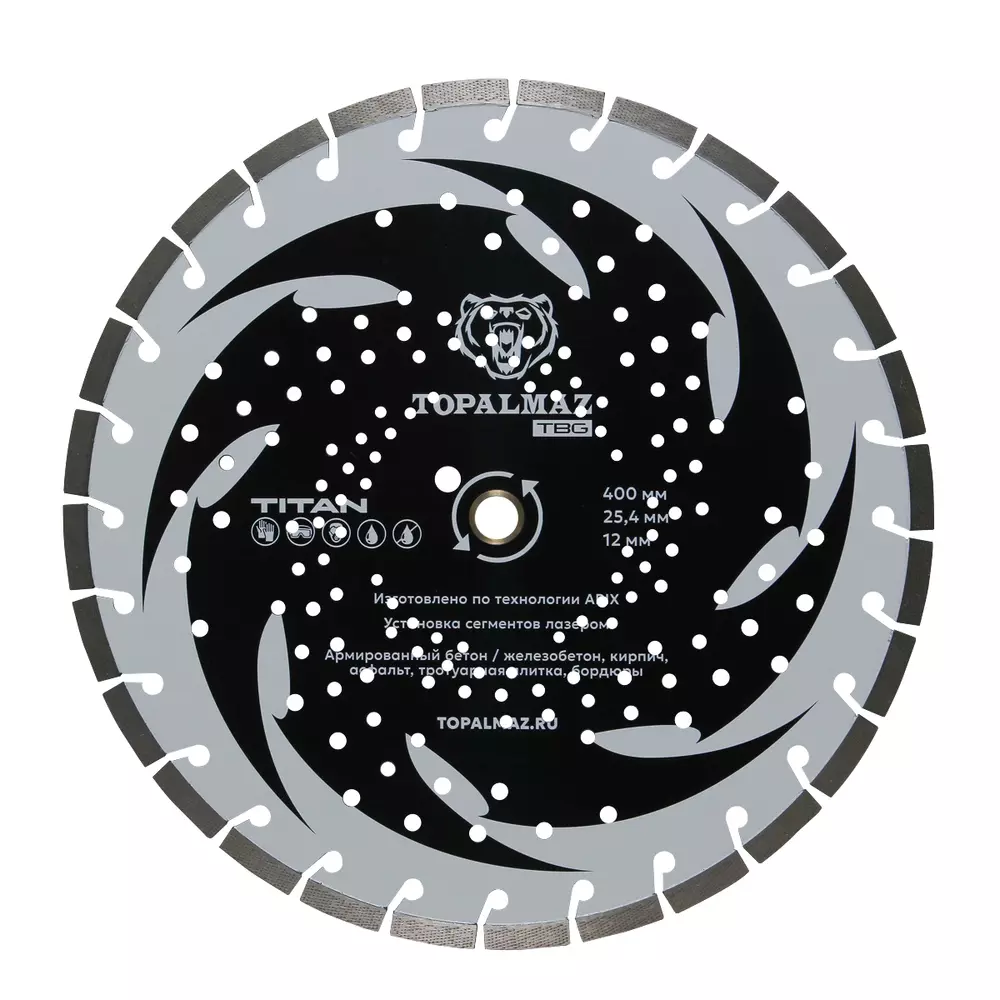 Диск алмазный отрезной для армированного бетона TOPALMAZ TITAN, диаметр 400 мм, посадочное 25,4 мм, высота сегмента 12 мм